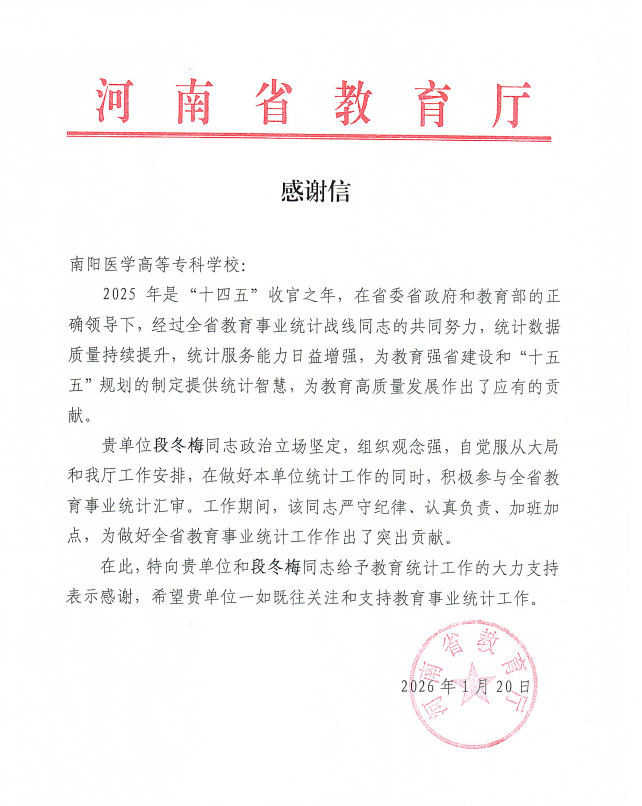 近日,我校收到省教育厅发来的感谢信,对我校在2025年全省教育事业统计工作中给予的大力支持表示充分肯定与感谢,并期待我校一如既往关注和支持教育事业统计工作。